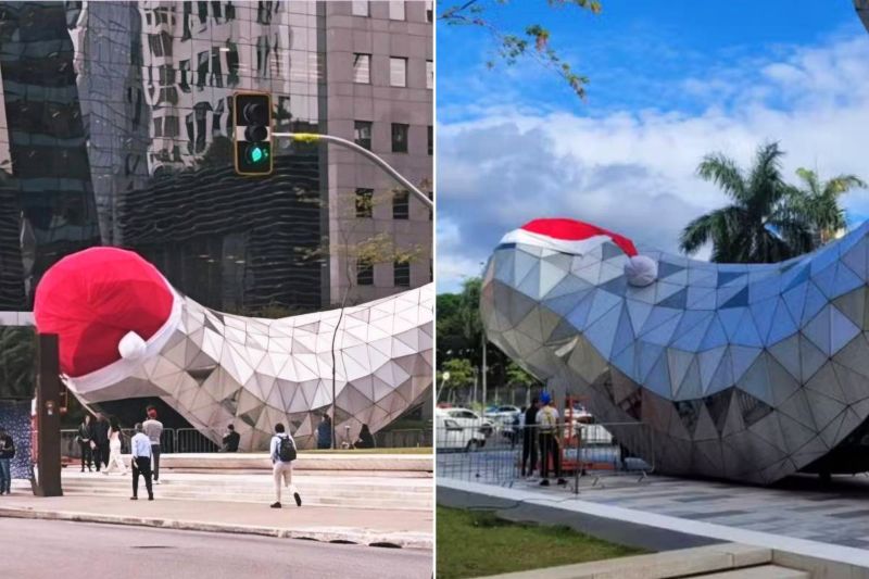 A baleia metálica que marca a entrada do Teatro B32, na Avenida Faria Lima, recebeu uma nova decoração de Natal após o gorro instalado na escultura viralizar por remeter a um órgão sexual masculino. O adereço, colocado no início da semana, era um chapéu de papai Noel vermelho que cobria quase todo o topo da obra e rapidamente se tornou assunto nas redes sociais.