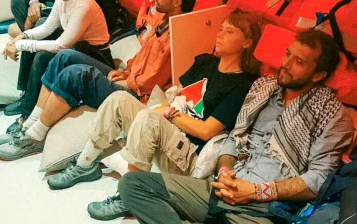 A ativista sueca Greta Thunberg e o ativista brasileiro Thiago Avila sentados em um navio a caminho de Israel - Foto: Israel Foreign Ministry / RFI / Reuters