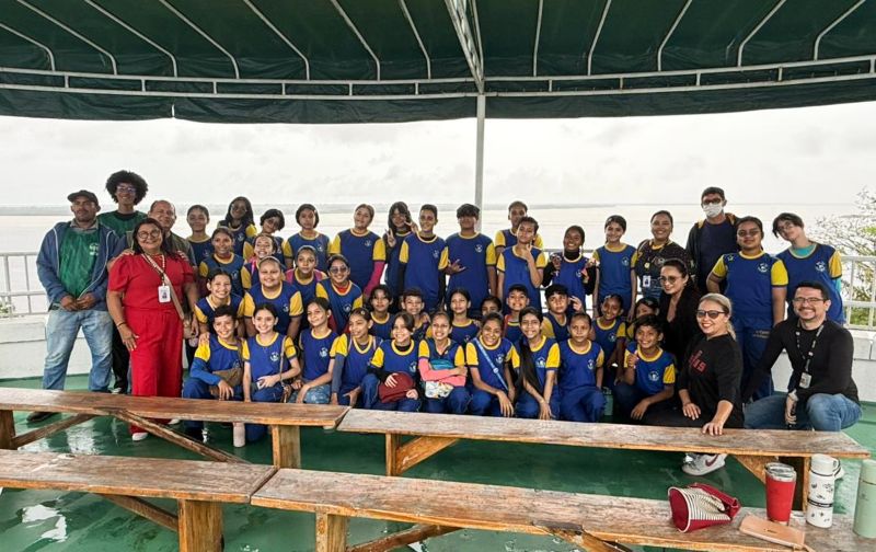 Durante a programação, os estudantes percorreram as dependências e conheceram iniciativas como o laboratório de sementes amazônicas, histórias dos povos originários e ancestrais, objetos arqueológicos, o mirante do Encontro das Águas e o condomínio de abelhas nativas.