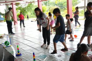 Na sequência, os participantes realizaram atividades lúdicas e educativas, incluindo oficina de pintura dos bois Garantido e Caprichoso, além do resgate de brincadeiras populares, como pula-corda, bambolê, amarelinha e cabo de guerra, promovendo momentos de convivência, aprendizado e lazer.